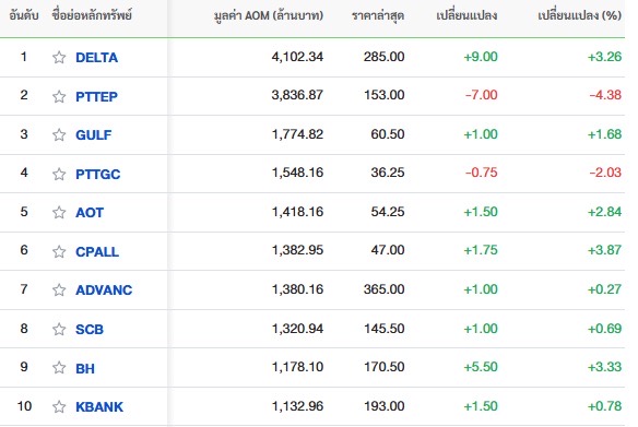 10 อันดับหลักทรัพย์ที่มีมูลค่าการซื้อขายสูงสุด