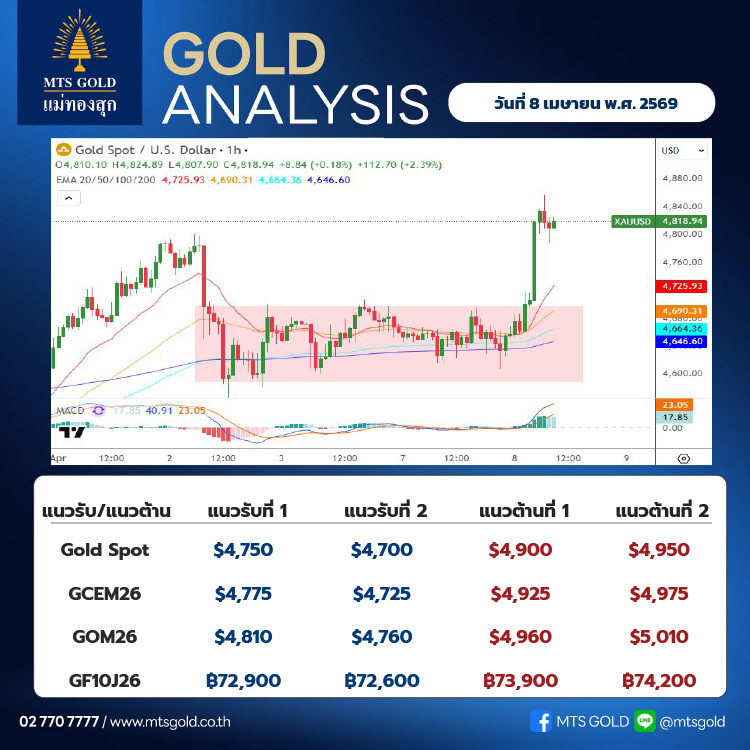 ในเชิงเทคนิค ราคาทองคำเคลื่อนไหวบนแนวโน้ม Sideway Up โดยทองคำได้ Breakout หลังจากเคลื่อนไหวในกรอบบริเวณ 4,400–4,600 เหรียญ ส่งผลให้ภาพระยะสั้นเริ่มกลับเข้าสู่แนวโน้ม ขาขึ้น ประเมินว่าหากราคาสามารถยืนเหนือเส้นค่าเฉลี่ยสำคัญบริเวณ 4,800 เหรียญ ได้อย่างมั่นคง มีโอกาสปรับตัวขึ้นทดสอบแนวต้านถัดไปบริเวณ 5,000 เหรียญ ซึ่งถือเป็นแนวต้านสำคัญในระยะสั้น อย่างไรก็ตาม หากไม่สามารถยืนเหนือระดับดังกล่าวได้ อาจเห็นแรงขายทำกำไรในระยะสั้น