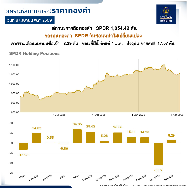 ด้านกองทุนทองคำ SPDR ไม่มีการเปลี่ยนแปลงการถือครอง ปัจจุบันอยู่ที่ 1,054.42 ตัน โดยภาพรวมในเดือนเมษายนยังคงเป็น ซื้อสุทธิ 8.28 ตัน โดยรวมยังคงสะท้อนแรงซื้อเข้าของนักลงทุนสถาบัน