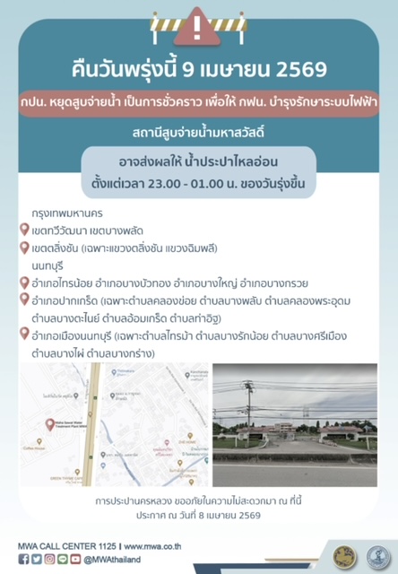 การประปานครหลวง (กปน.) ขอแจ้งให้ทราบว่า การไฟฟ้านครหลวง (กฟน.) จะดำเนินการตามแผนบำรุงรักษาระบบไฟฟ้า ในพื้นที่บริเวณสถานีสูบจ่ายน้ำมหาสวัสดิ์ จึงอาจมีความจำเป็นต้องหยุดสูบจ่ายน้ำ สถานีสูบจ่ายน้ำมหาสวัสดิ์ เป็นการชั่วคราว ในคืนวันพรุ่งนี้ (วันพฤหัสบดีที่ 9 เมษายน 2569) ตั้งแต่เวลา 23.00 - 01.00 น. ของวันรุ่งขึ้น โดยระหว่างดำเนินการ อาจส่งผลให้ น้ำประปาไหลอ่อน ในพื้นที่ดังต่อไปนี้