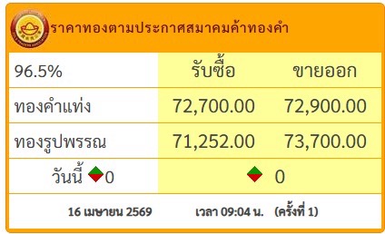 ทองเปิดตลาดวันนี้ (16 เม.ย.69) "คงที่" ทองรูปพรรณ ขายออก 73,700 บาท