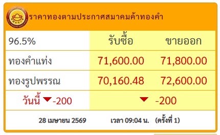 สมาคมค้าทองคำประกาศราคาทองวันนี้ (28 เม.ย.2569) ครั้งที่ 1 ปรับลดลง 200 บาท เทียบกับราคาปิดเมื่อวานนี้