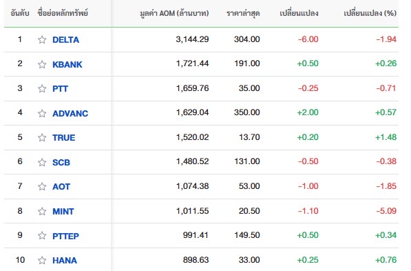 10 อันดับหลักทรัพย์ที่มีมูลค่าการซื้อขายสูงสุด